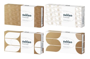 Super soft, skin-friendly, firm, and absorbent: Satino PureSoft facial tissues offer 100% recycled high quality, made from cardboard, in a designer flat box.